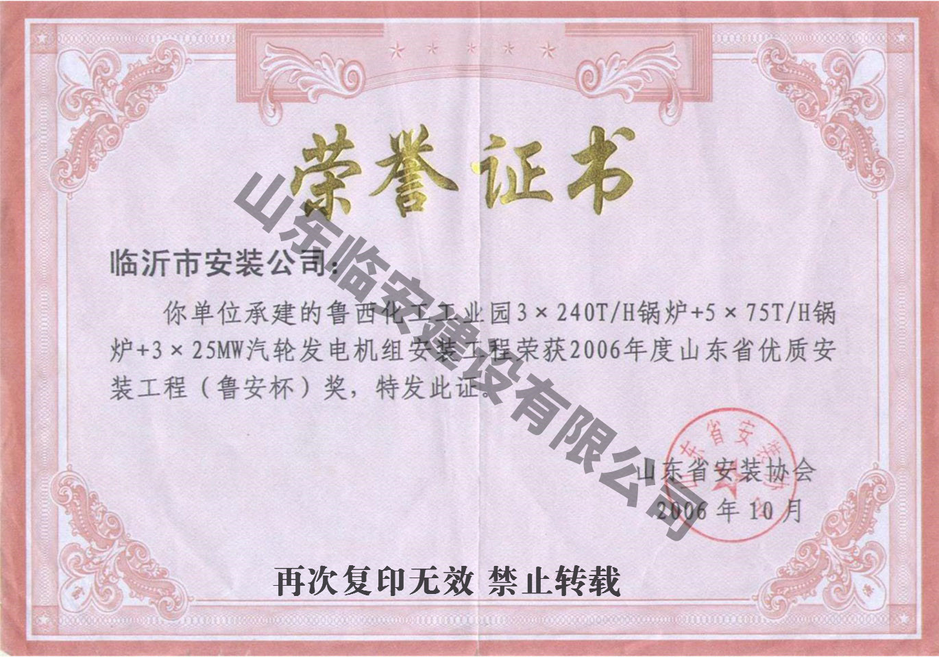 山東臨安建設有限公司(原名臨沂市安裝公司)始建于一九六六年,是由老國企改制的股份制企業,公司總部位于羅莊區通達路211號,現有職工1000余名,各類工程經濟技術人員816名,其中高中級職稱64名,初級職稱204人。主要從事機電工程施工總承包,電力施工總承包,石油化工施工總承包,建筑裝飾裝修施工總承包,鍋爐安裝、改造I級(參數不限),GB1、GB2(2)級、GC1級、GD1級壓力管道安裝,起重機械B級安裝,電力設施承裝、承試,并取得了GB/T19001-2008質量管理體系認證證書、GB/T28001-2011職業健康安全管理體系認證證書、GB/T24001-2004環境管理體系認證證書,資信等級“AAA”級。